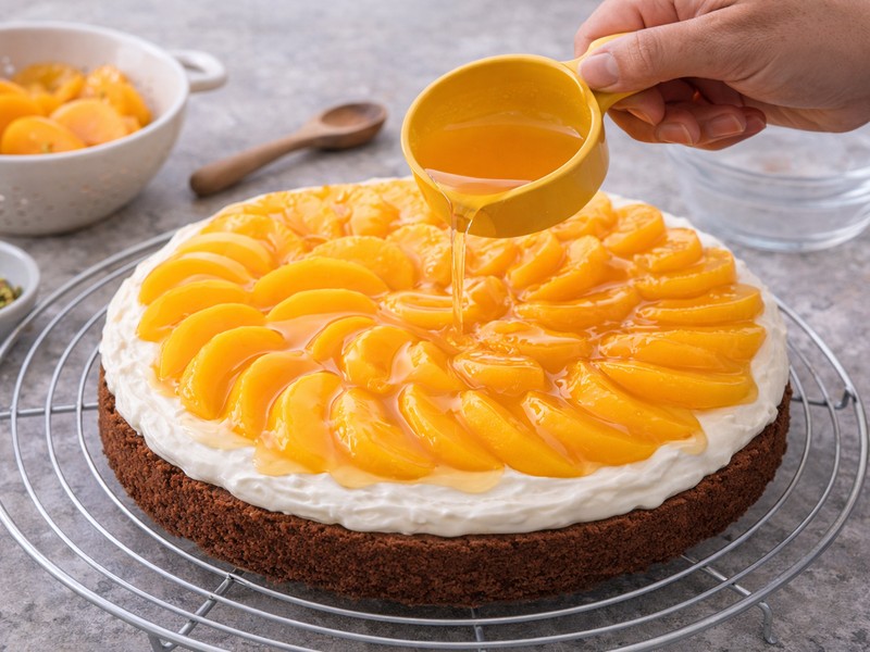 Danach den Tortenguss von der Mitte her gleichmäßig über die Pfirsiche verteilen.